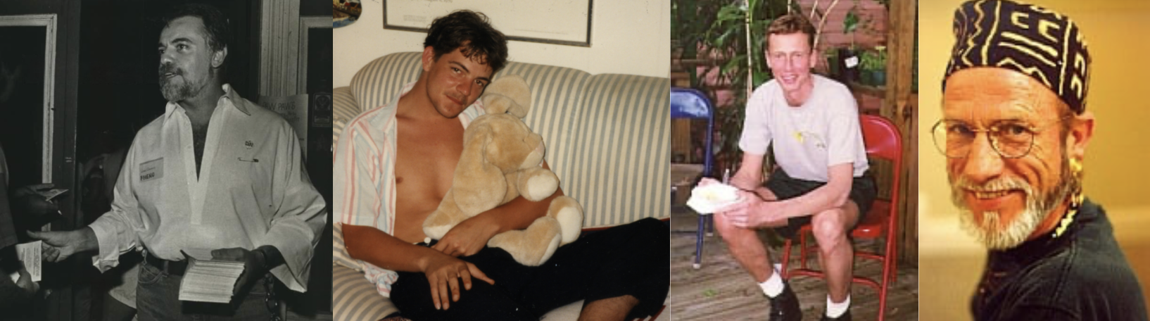 L to R: John Ognibene passing out safer sex materials at AIDS benefits at Paw Paw's bar (1985), Peter DeLancey (1994), Carlos “Cliff” Howard, Jr. at Faerie Playhouse (date unknown), John Horn Foster, (date unknown)